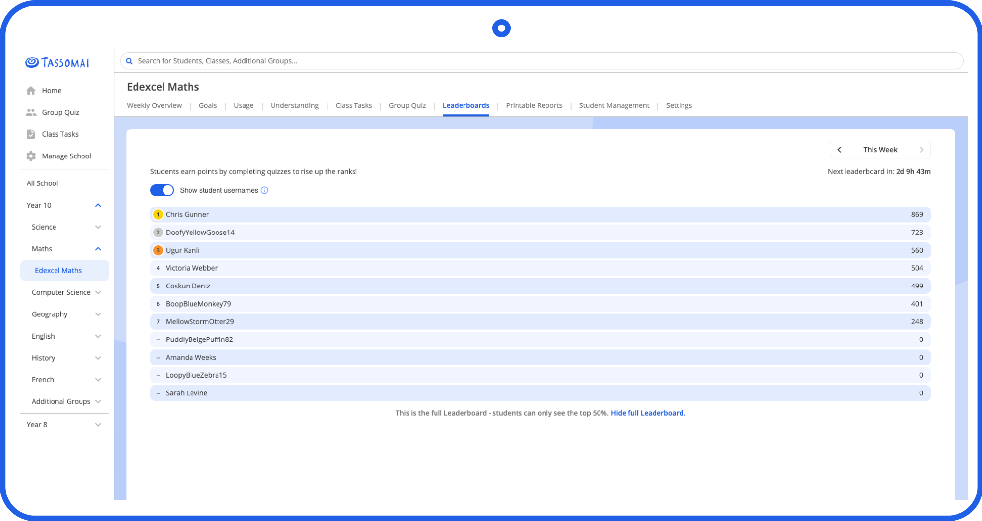 The Tassomai team are pleased to be rolling out Leaderboards, a new way to foster healthy classroom competition and support engagement.