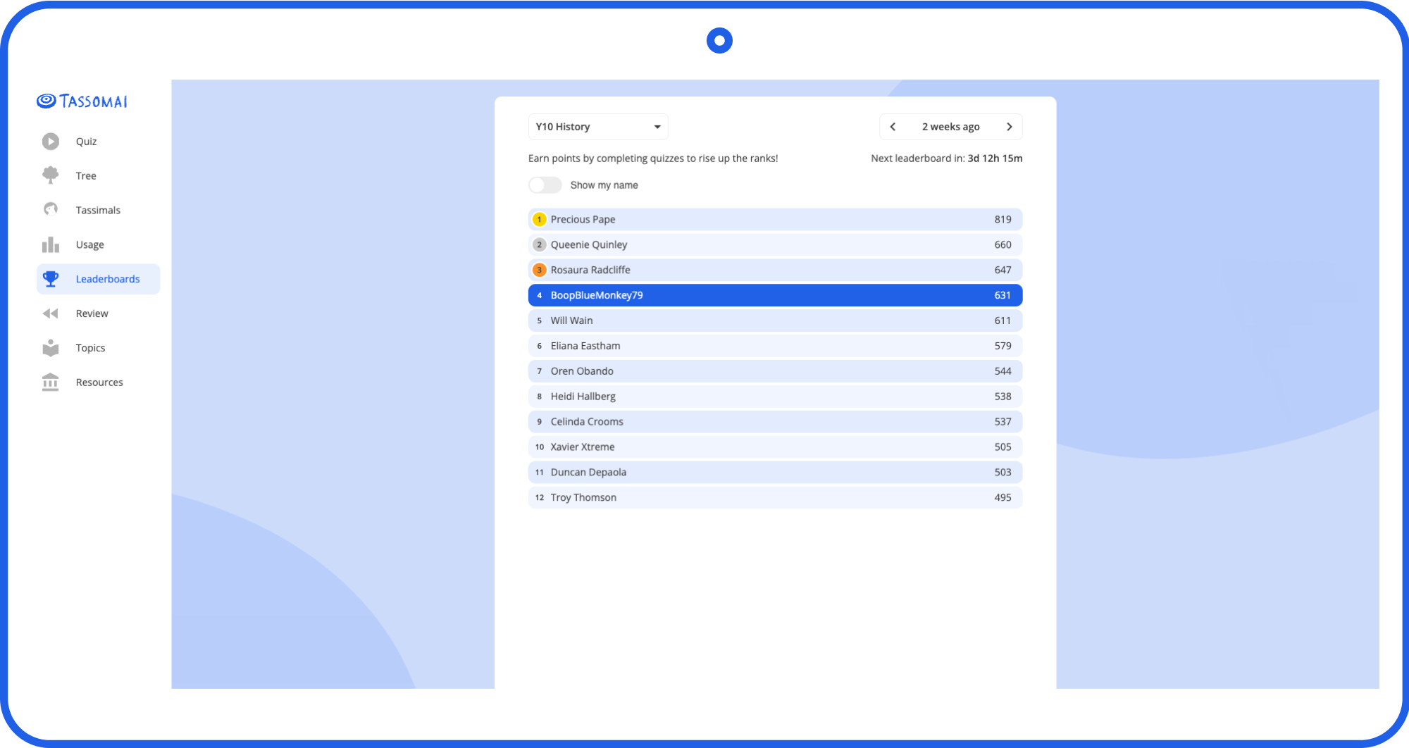 Leaderboards allow teachers to run clear and simple weekly competitions where students in each class compete to earn the most points through quizzing.